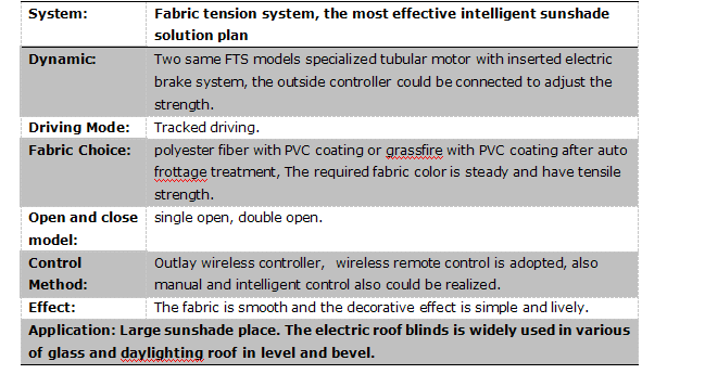 電動遮陽百葉FTS電動天棚簾特別適用于普通電動卷簾無法安裝的彎曲、傾斜的場合,整個系統由驅動系統、面料和控制系統三部分組成,驅動系統采用2個FTS專用管狀電機,分別安裝在兩條卷管中,面料一端固定在其中一條卷管上,固定面料另一端的鋼絲繩卷曲在另一條卷管的卷繩器上。這兩臺電機通過一個專用的控制器協調工作,其中一臺電機提供面料運行的動力,另一臺電機的剎車同時工作,提供一定的阻力拖住面料,避免面料下墜,天棚完全打開后,面料會卷在其中一條卷管上,運行中或停止時面料均有張力,可制作大面積的平面或弧形面的天棚簾系統。