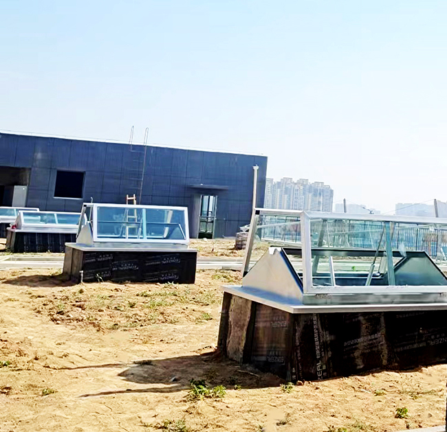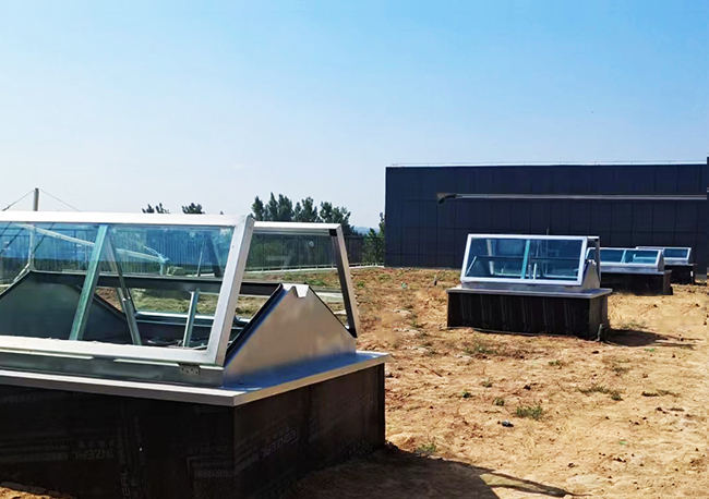 天窗外觀為三角形,天窗頂部可采用采光板或玻璃,有效增加室內(nèi)采光,且防水性好。開啟電機設(shè)計成24V安全電壓,可連接消防聯(lián)動控制系統(tǒng)及風(fēng)、雨、煙感應(yīng)器。***開啟角度為60°。