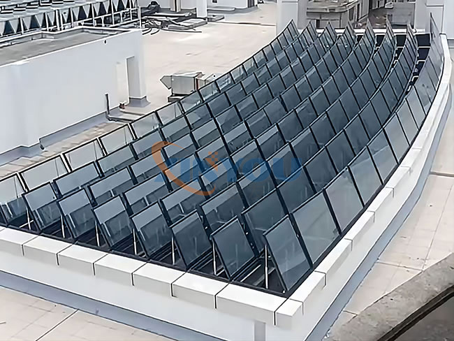 頂面系統(tǒng)選用FSS電動遮陽簾,即每套遮陽簾系統(tǒng)包含一套管狀的驅(qū)動電機(jī)和一套FSS專用的彈簧機(jī)構(gòu)系統(tǒng)通過電機(jī)帶動卷繩器的旋轉(zhuǎn)拉動鋼絲,牽引面料,從而達(dá)到遮陽作用。電機(jī)反轉(zhuǎn)則可通過彈簧的反作用力收回面料,可實(shí)現(xiàn)采光效果。