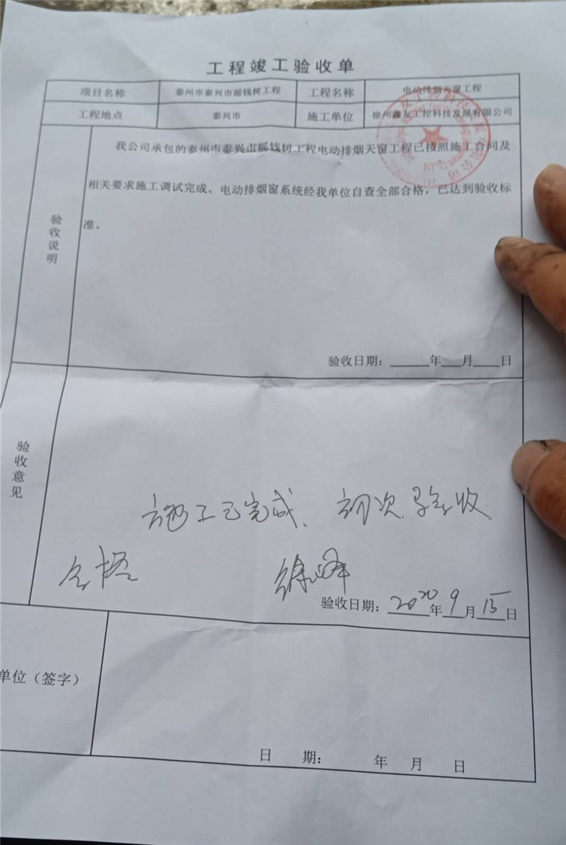 9月15日,現(xiàn)場進(jìn)行了初步驗收,所有電動排煙天窗及配套設(shè)備運行正常,達(dá)到驗收標(biāo)準(zhǔn)!項目負(fù)責(zé)人簽寫工程驗收單。