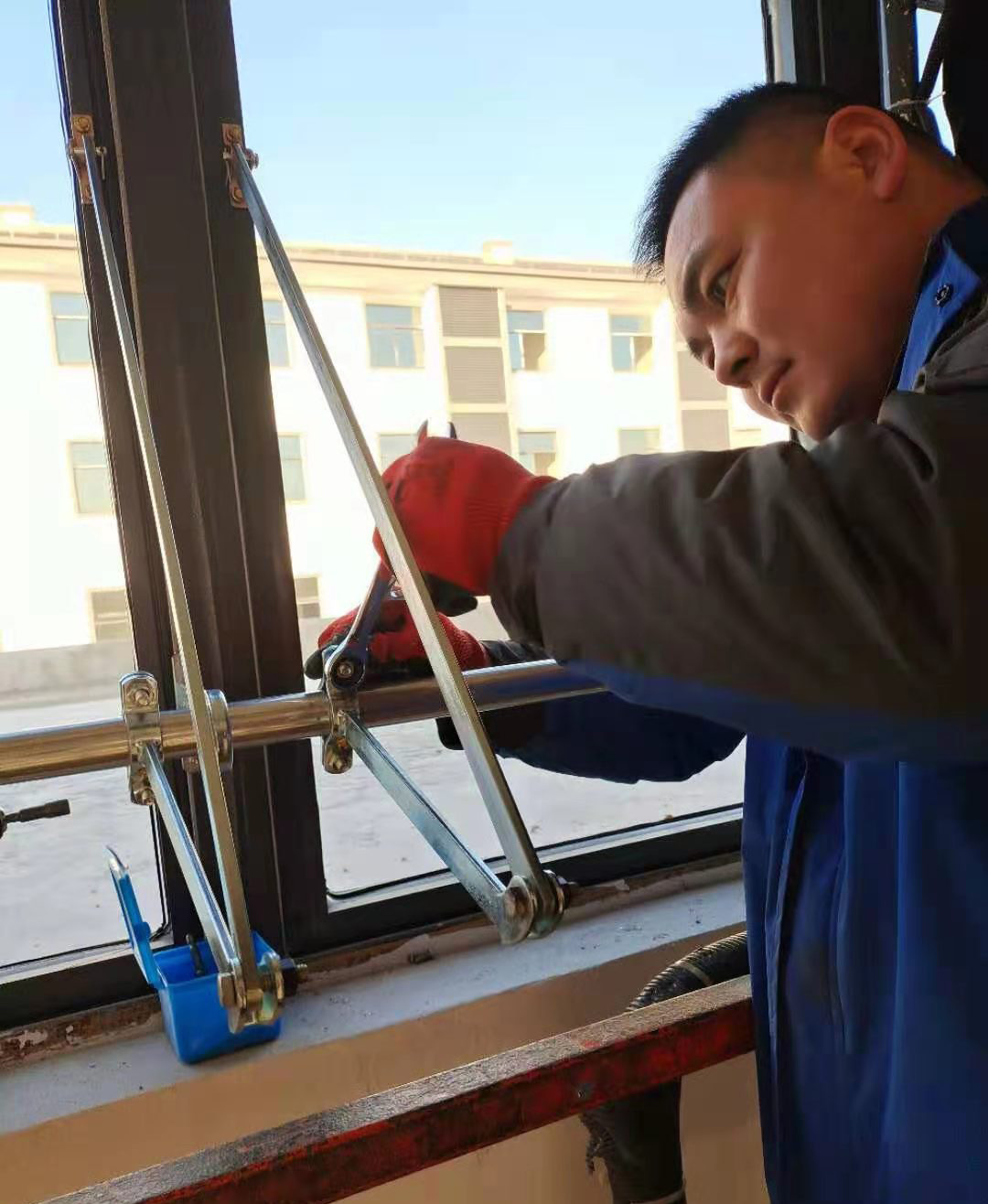 此次電動排煙窗工程采用曲臂聯(lián)動電動開窗器,由螺桿式電動開窗器驅(qū)動。