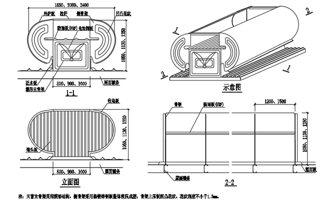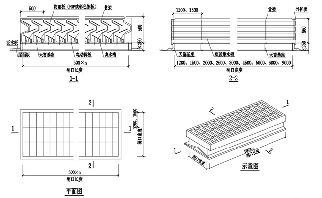 3. 通風天窗側面外護板為彩鋼壓型板,泛水包邊板用彩鋼板折彎而成。